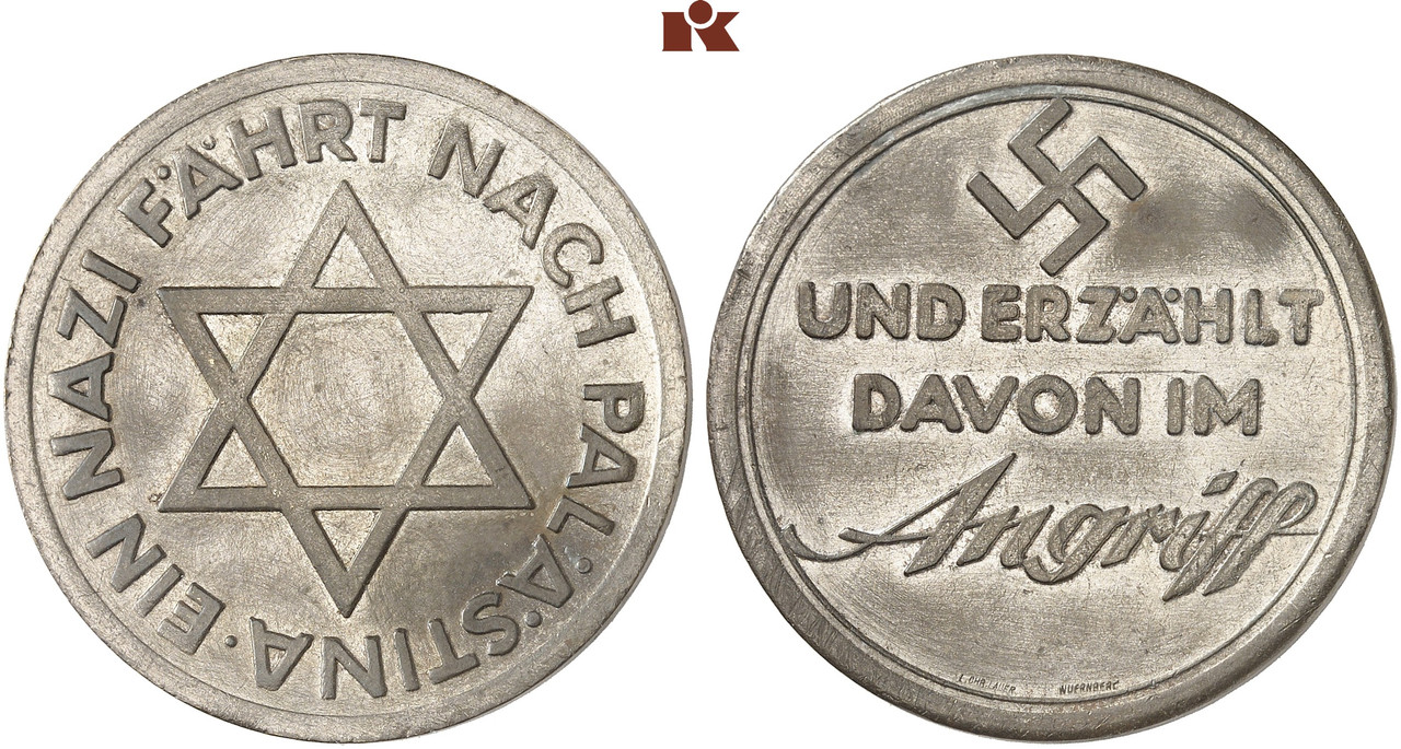 Historický kontext: Medaile připomínala reportážní cestu SS důstojníka Leopolda von Mildensteina do Palestiny, doprovázeného sionistickým představitelem Kurtem Tuchlerem. Cílem nacistického Německa v té době (před zahájením masového vyvražďování) bylo podpořit emigraci Židů z Německa.