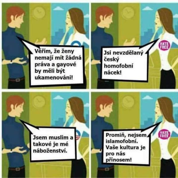 Ty uz bys mohl taky zavrit usta, nikoho jsem nevitala a nevitam, sama jsem odesla a tak priznavam totez pravo komukoliv jinemu, necht si kazdy zkusi, co to obnasi odejit do neznameho prostredi bez znalosti pomeru a jazyka a budovat si existenci...pod­minky byly drive mnohem tvrdsi, nikdo nikomu zadara nic nedal, zapadni staty udelaly chybu, ze uprchlikum sypaly jak slepicim, komu by se pak chtelo pracovat ? Doslova je zkazily, pak se nemuzou divit, ze prichazeji dalsi a dalsi...odmitam lidi soudit podle pleti, rasy a pohlavi, kazdy ma pravo vybrat si viru, nebo nemit zadnou...takze si nech ty tve pitome obrazky pro svoje souverce!