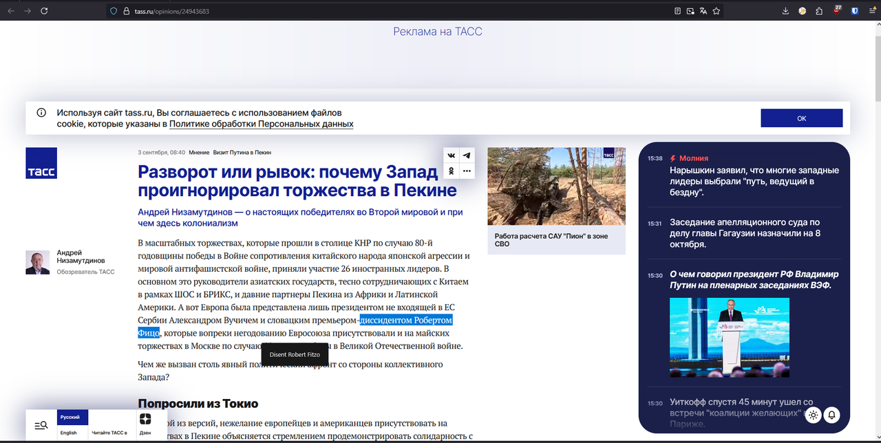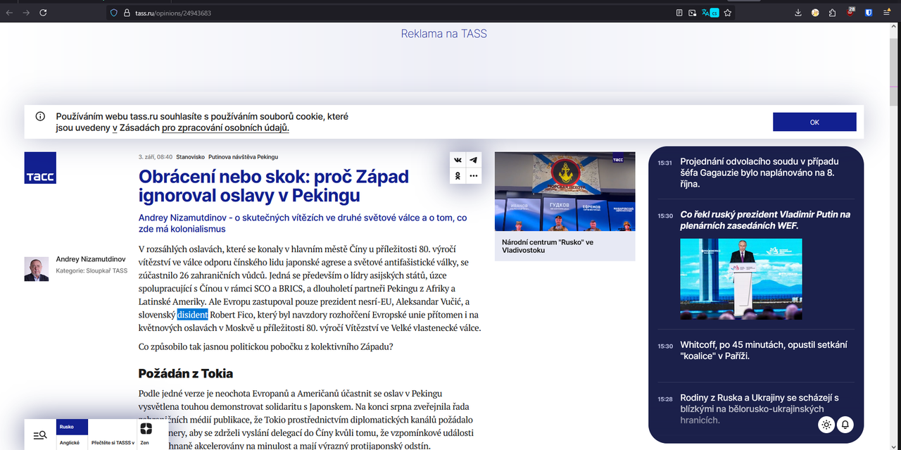 Omlouvám se za předchozí nejasnosti. Po důkladném prohledání TASS-archivu jsem zjistil, že článek Andreje Nizamutdinova s přesným tématem „proč Západ ignoroval čínskou armádní přehlídku a proč tam z Evropy dorazil jen Fico a Vučić“ se v archivu TASSu očividně nenachází nebo nebyl publikován pod touto formulací.