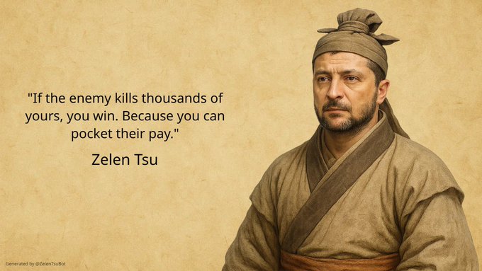 Jenže to není filozofie velkého stratéga jakým je nosatej Zelen Tsu. *4511* *23266* *27482* Ten myslí že:" Když ti nepřítel zabije tisíce vojáků tak vyhráváš,protože jim nemusíš zaplatit"!