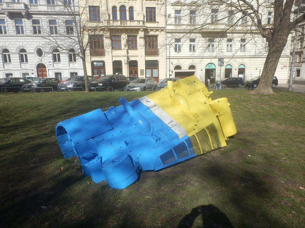 Pamatujete na tank co Kocáb namaloval na růžovo?? Tak na tom místě je dnes fontána a naproti přes ulici postavili jako hanbu tohle zakopaný do země. Když začala válka tak to namalovali na žlutomodro a věšeli se na to ukrajinský a český praporky ale to netušili, že takhle dopadne Ukrajina. *709* Včera jsem jel kolem tramvají a už to tam není! *4511* *4511*